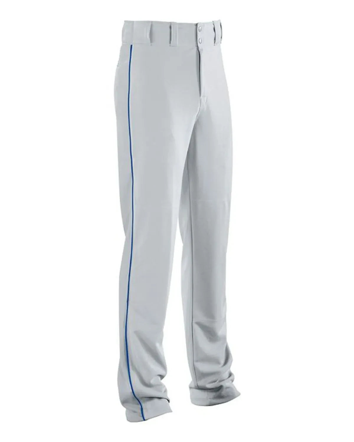 11oz 100% Polyester double-knit. Contrasting piping sewn in side seam. Two-snap closure with nylon zipper. Five pro-style belt loops. Double-layer fabric at knee area. 33-inch inseam on adult large. 25 1/2-inch inseam on youth medium. Two double-welt set-in back pockets. Elastic waistband. Double-needle hems (Easily shortened for custom length).
